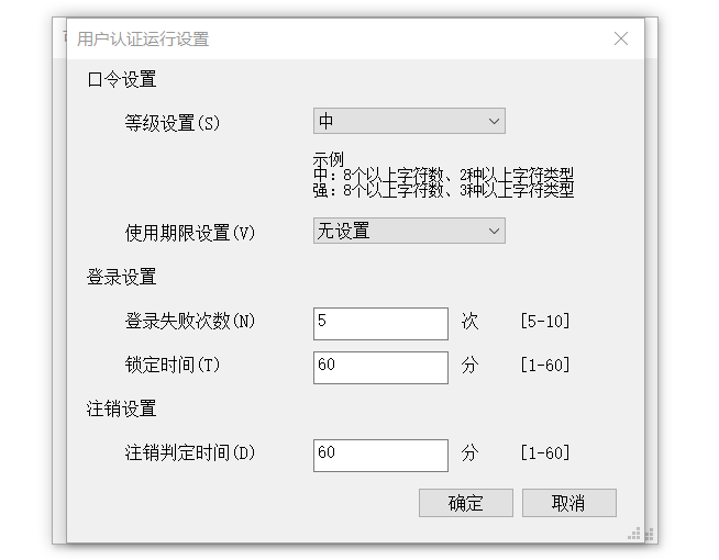 1.等級設置:可以規定口令的強度等級。(中:2種字符;強:3 種字符)