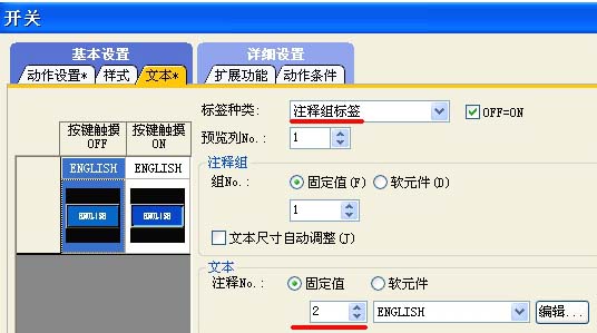 我們在窗口畫面中加入兩個開關(guān)做語言切換和一個返回開關(guān)。開關(guān)的建立和第一個開關(guān)建立相似,標簽種類都為注釋組標簽,動作都設(shè)為點動。軟元件名分別為 M10、M11、M12。文本注釋 NO 的固定值分別為 2、3、4。