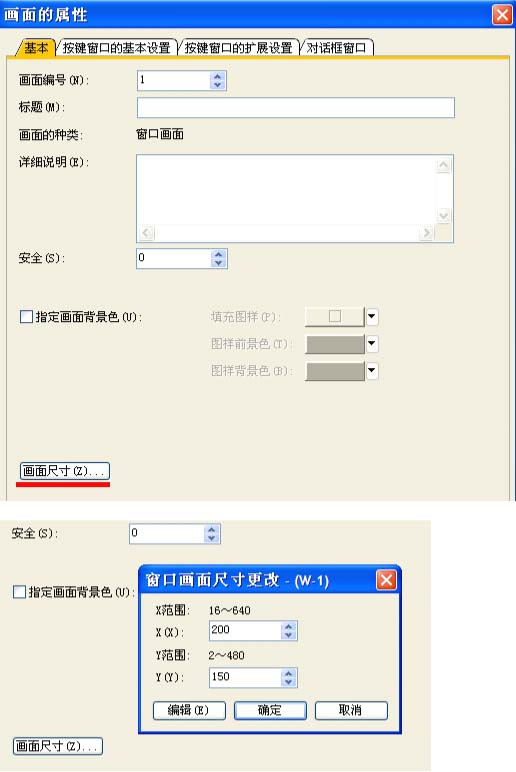 在畫面的屬性對話框中,標題可以不填寫。其它地方不做修改,只需把畫面尺寸改小一點。