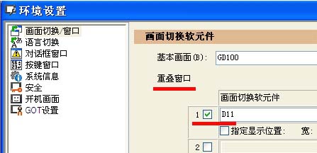 在環(huán)境設(shè)置對話框中,重疊窗口這一欄選中第 1 個復選框,然后在畫面切換軟元件中輸入一個字元件。其它地方不做修改,點擊確定。