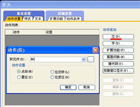 在動作設(shè)置里面點擊位(B),輸入軟元件名:M0 并把動作設(shè)置為點動,點擊確定。
