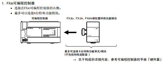 解答:三菱FX3U最多可以連接4臺模擬量特殊適配器,最多可以連接8臺特殊功能模塊,拓展方式如下圖: