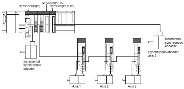 首先在如下圖所示,外部同步編碼器可以通過以下三種方式連接到三菱PLC Q172DS Motion的控制系統當中。通過外部連接的同步編碼器的輸入脈沖驅動輸入軸,投入電源后就可以監控同步編碼器的狀態.