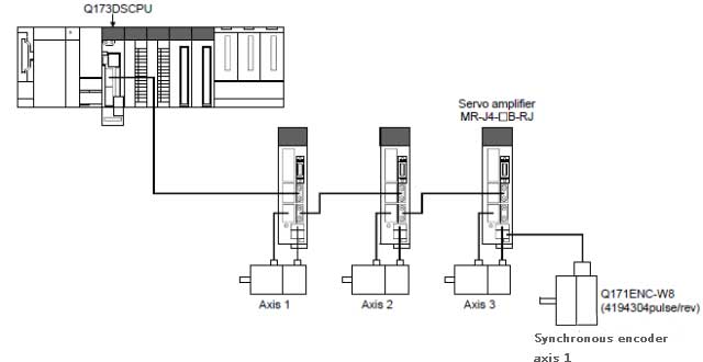 再比如另一種情況,假設三菱PLC模塊QD77MS控制的16軸需要進行同步控制,但是主軸是來自其他模塊控制的或者其他系統的三菱伺服放大器,則其不能當作伺服輸入軸,而需要通過三菱PLC同步編碼器軸進行輸入。