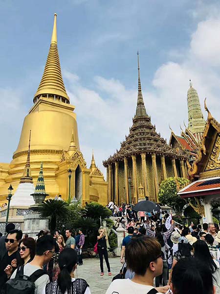 第一站:首先是到泰國必游的大皇宮與玉佛寺,游大皇宮和寺有許多的禮儀規矩,如:在入大皇宮時,不能穿拖鞋,上衣不能穿無袖下身著裝必須蓋過膝蓋,入寺廟需脫鞋等等,不過在此之前海藍的小伙伴早就做好相關的功課,當然是順利進行游玩,小編提醒:還沒去過泰國旅游的小伙伴在去泰國一定要做好相關功課,了解當地習俗文化,不然會被擋在門外喲!