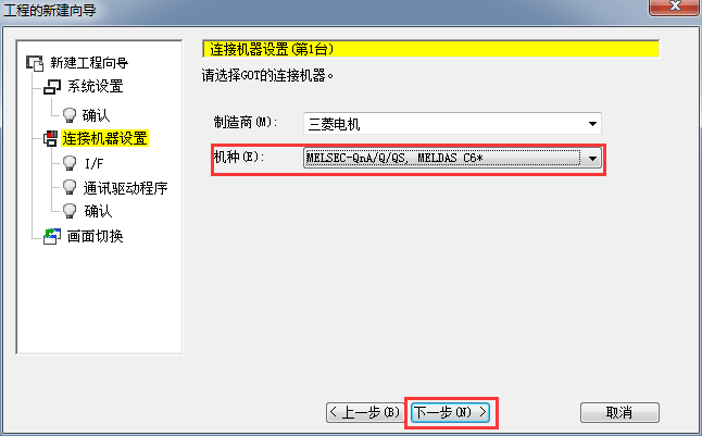2.1.4 設置連接機種類型,需根據(jù)機種選擇,后單擊[下一步]