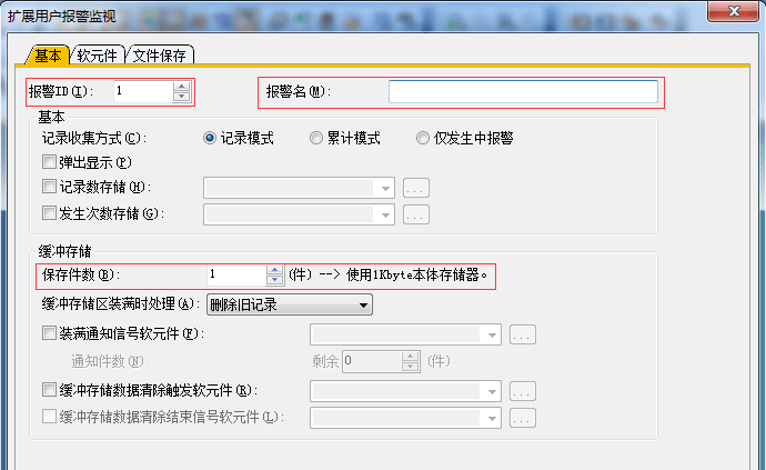 2.3.3 擴展用戶報警監(jiān)視-基本設置,設置報警ID及名稱,一般默認1,報警名可自定義,保存件數(shù)(設置與報警點數(shù)相同)可增加,用于報警存放報警點數(shù)。