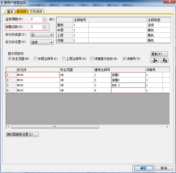 2.3.3 擴展用戶報警監(jiān)視-軟元件設置,設置完后單擊[確認]