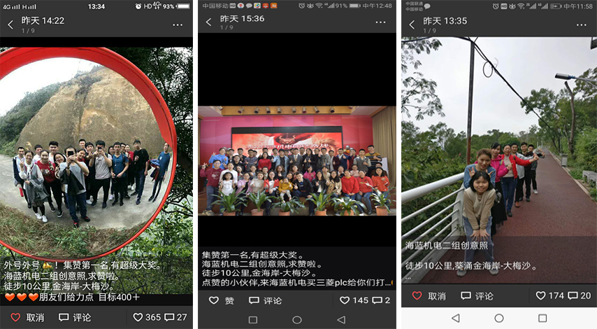 早餐完畢,約摸九點(diǎn)。我們各組便帶上任務(wù)開始了徒步之旅,從金海岸徒步至大梅沙食午飯,總程約10公里。大家是不是很好奇,這個(gè)任務(wù)是什么,竟要徒步10公里來完成,其實(shí)這個(gè)任務(wù)很簡(jiǎn)單,就是徒步過程中,各組組員一起完成創(chuàng)意拍照,然后前去朋友圈收集點(diǎn)贊,點(diǎn)贊者最多的組可獲得神秘禮品一份(領(lǐng)導(dǎo)為了我們鍛煉身體也是用心良苦了)。于是我們都使出了各種招兒,讓朋友幫自己點(diǎn)贊,甚至不惜群發(fā)騷擾-_- ,這會(huì)我想我應(yīng)該被不少人拉黑了吧。